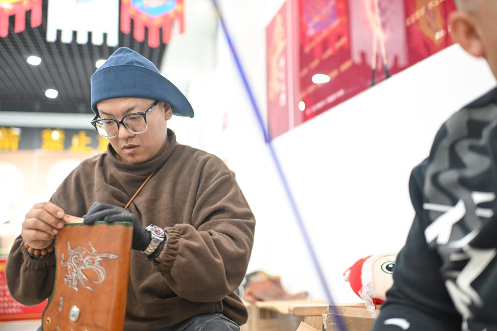 10月23日、伊寧市にある弓術館で革製の矢筒を製作する呉俊亮さんの弟子、姜凱文(きょう・がいぶん)さん。(伊寧=新華社記者/胡虎虎)