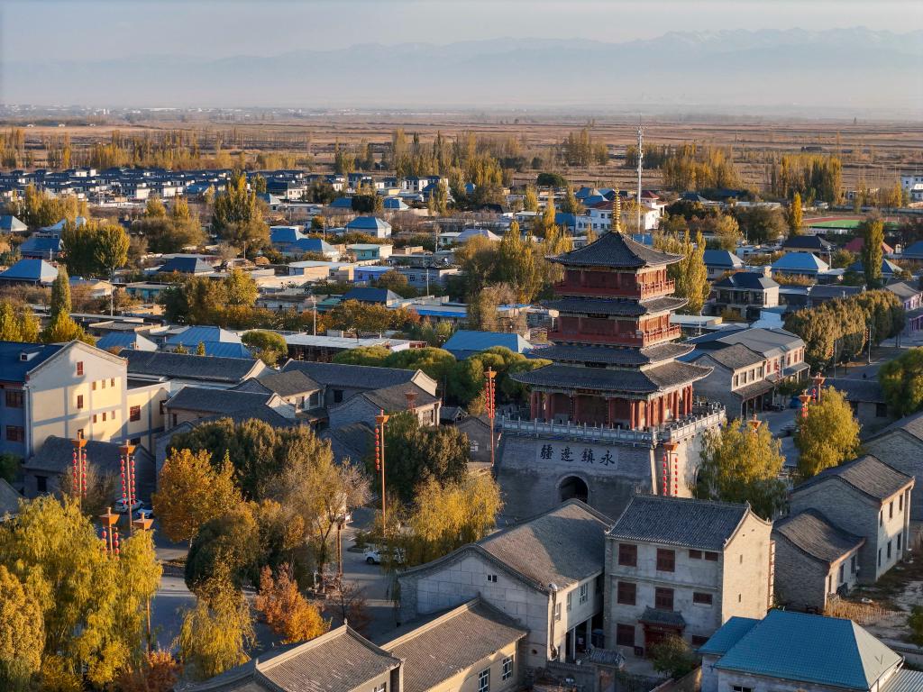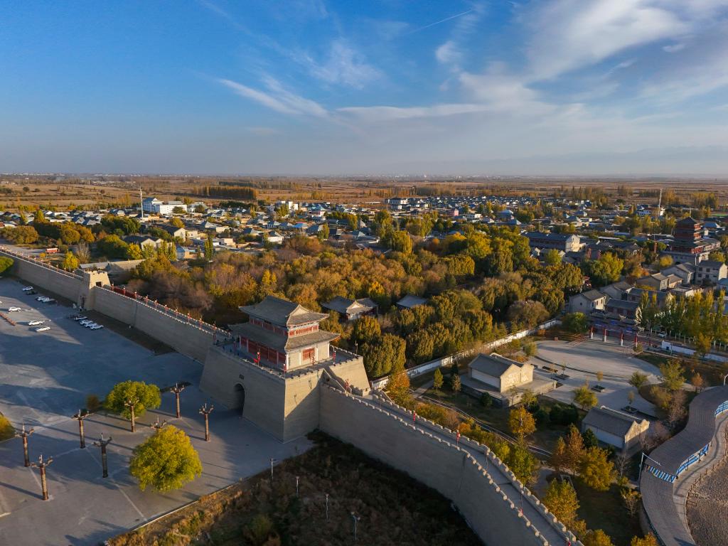 10月24日、呉俊亮さんのふるさとで、シベ古城風景区のあるチャプチャル・シベ自治県孫扎斉牛録鎮。(ドローンから、チャプチャル・シベ=新華社記者/胡虎虎)