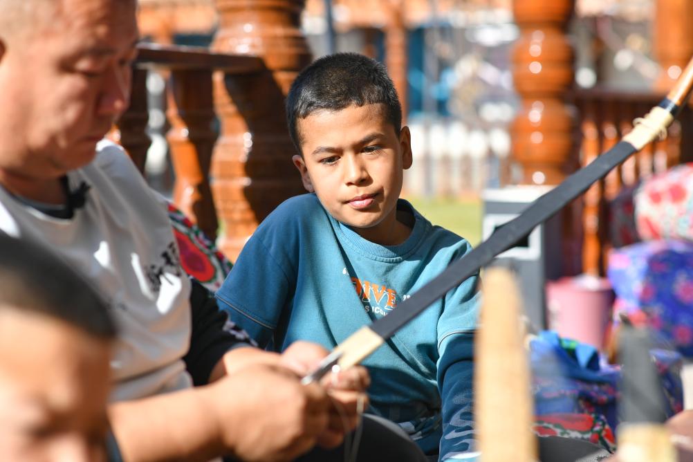 10月25日、伊寧市にある弓術館で伝統弓を修理する呉俊亮さんを見学する子ども。(伊寧=新華社記者/胡虎虎)