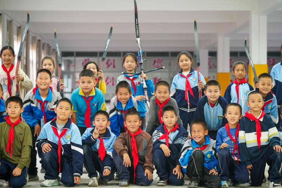 10月23日、伊寧市第25小学校で、トレーニング後に集合写真を撮る弓術クラブの子どもたち。クラブは呉俊亮さんが立ち上げた。(伊寧=新華社記者/徐宏岩)