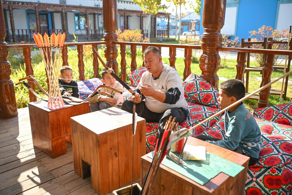 10月25日、近所の子どもたちが集まって見守る中、伊寧市にある弓術館で伝統弓を修理する呉俊亮さん。(伊寧=新華社記者/胡虎虎)