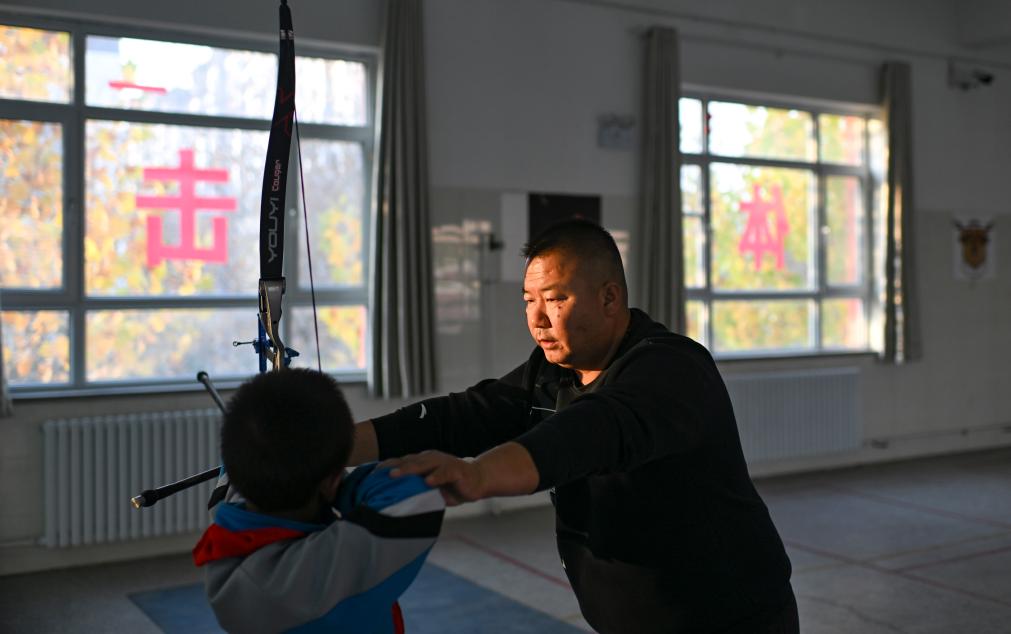 10月23日、伊寧市第25小学校で弓術クラブの児童に現代的なリカーブボウを指導する呉俊亮さん(左)。(伊寧=新華社記者/胡虎虎)