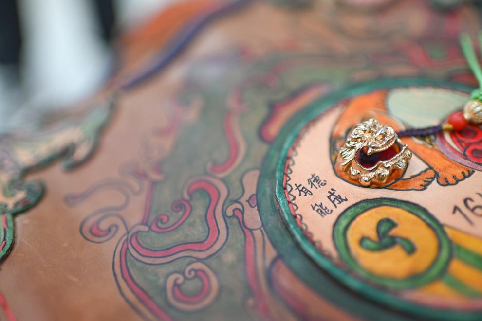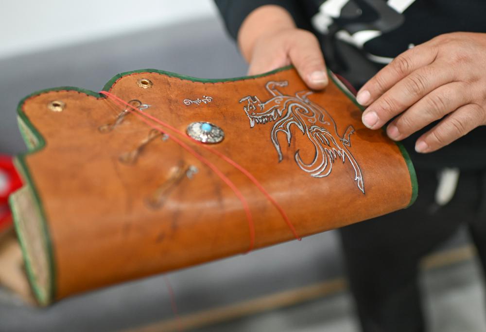 23日、伊寧市の弓術館に展示されている呉俊亮さんの弟子、姜凱文(きょう・がいぶん)さんが製作した革製の矢筒。(伊寧=新華社記者/胡虎虎)