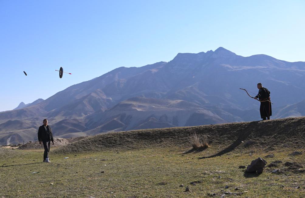 10月24日、チャプチャル・シベ自治県南部近郊の山あいにある草原で、重い伝統弓による移動標的の速射を練習する呉俊亮さん(右)。(チャプチャル・シベ=新華社記者/胡虎虎)