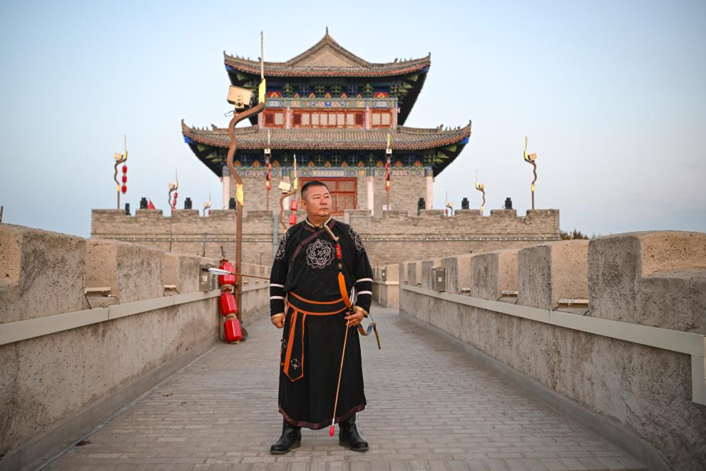 10月24日、チャプチャル・シベ自治県にあるシベ古城風景区で、弓矢を持って城壁に立つ呉俊亮さん。(チャプチャル・シベ=新華社記者/胡虎虎)
