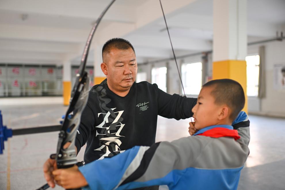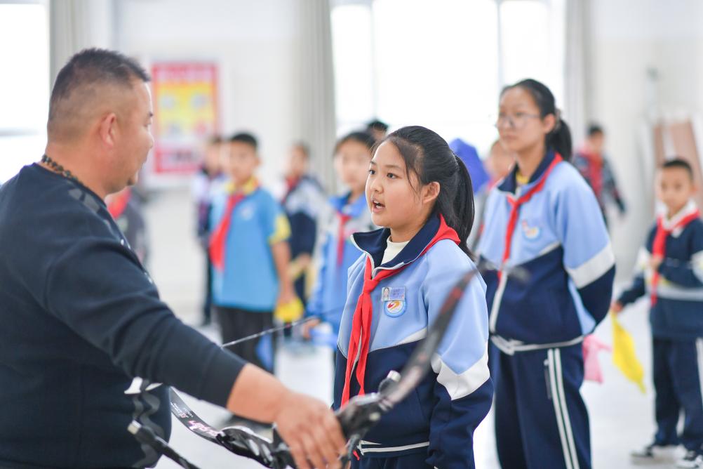 10月23日、伊寧市第25小学校で弓術クラブの児童に現代的なリカーブボウを指導する呉俊亮さん(右)。(伊寧=新華社記者/胡虎虎)