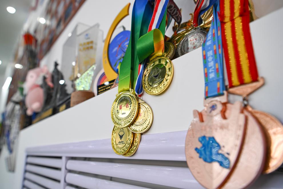 10月25日、呉俊亮さんが大会で獲得したメダルとトロフィーの一部。(伊寧=新華社記者/胡虎虎)