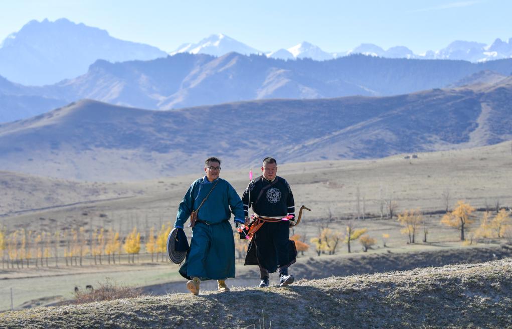10月24日、チャプチャル・シベ族自治県南部近郊の山あいにある草原で、弓矢と的を手に歩く呉俊亮さん(右)と弟子の姜凱文(きょう・がいぶん)さん。(チャプチャル・シベ=新華社記者/胡虎虎)