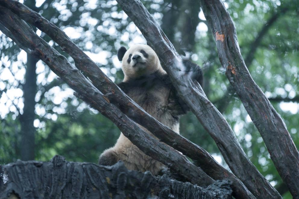 10月22日、木の枝の間から顔を見せたシャンシャン。(成都=新華社配信/Panda365提供)