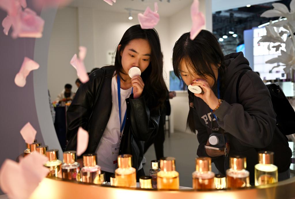 第7回輸入博会場のロレアルのブースで香水の香りを試す来場者。(2024年11月9日撮影、上海=新華社配信)