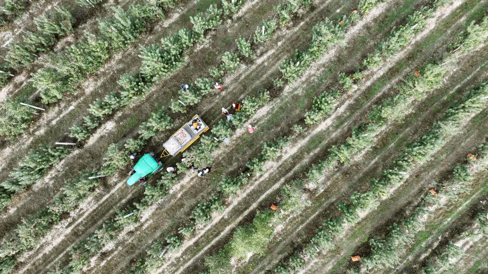 中衛市沙坡頭区のリンゴ栽培拠点で収穫する農家。(10月25日、ドローンから、中衛=新華社記者/王鵬)