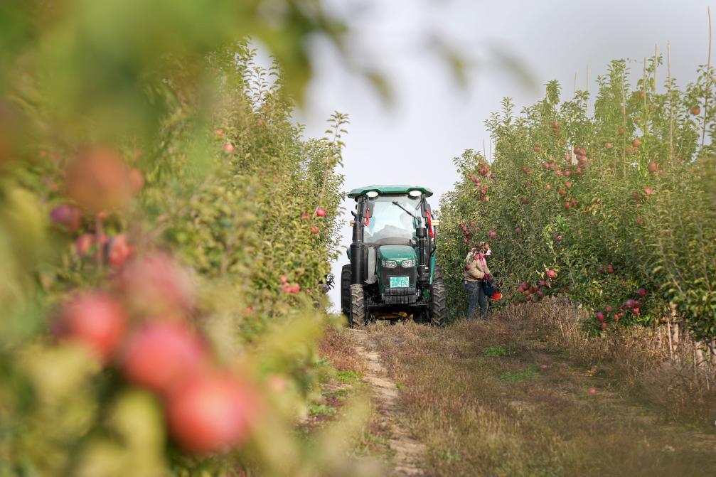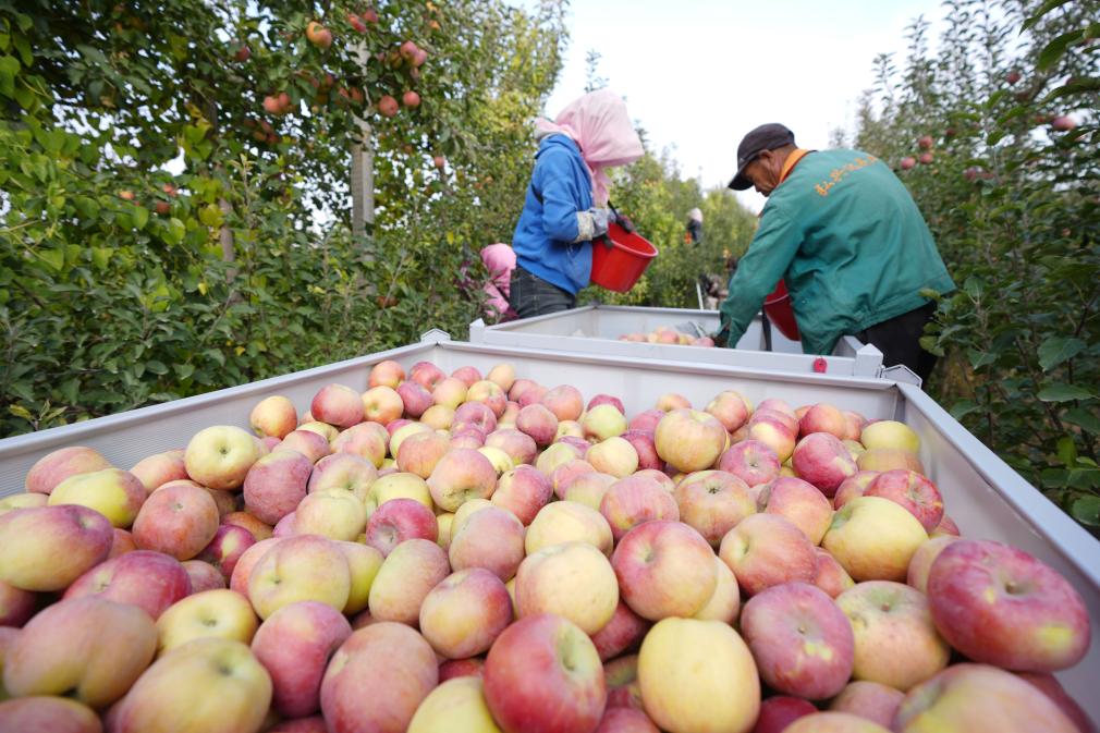 中衛市沙坡頭区のリンゴ栽培拠点で収穫する農家。(10月25日撮影、中衛=新華社記者/王鵬)