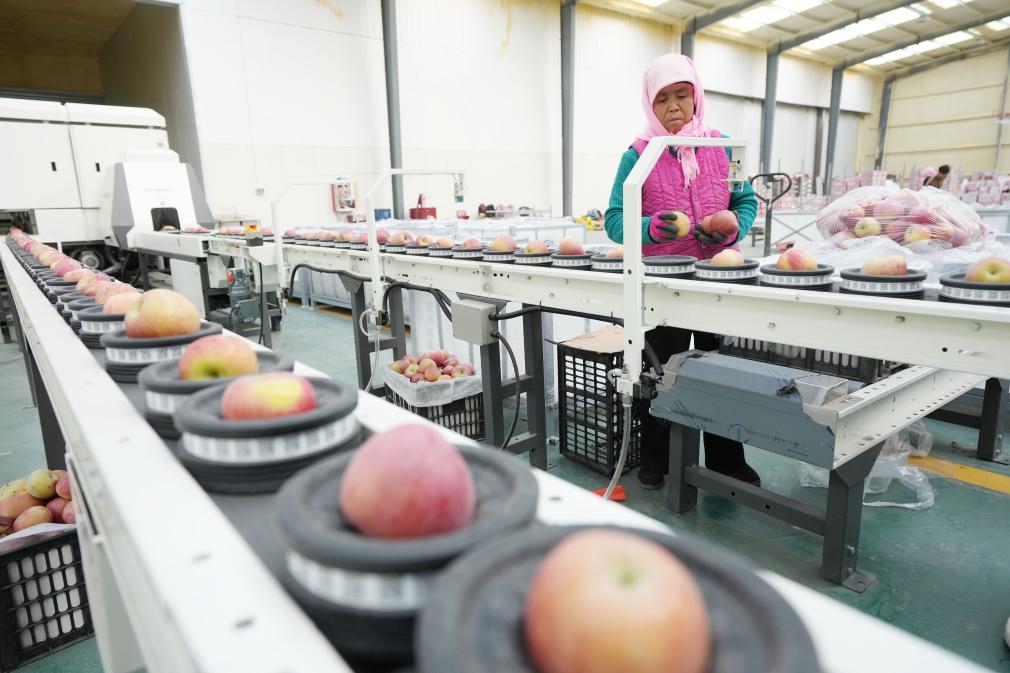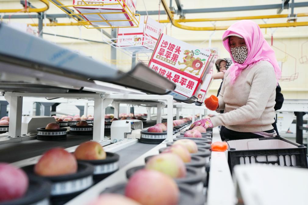 中衛市沙坡頭区の加工企業でリンゴを選別する作業員。(10月25日撮影、中衛=新華社記者/王鵬)