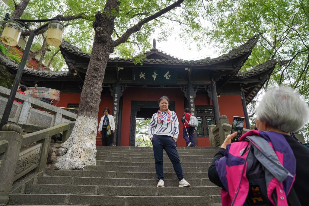 10月27日、重慶市奉節県の白帝城風景区を散策する人々。(重慶=新華社記者/周佳誼)