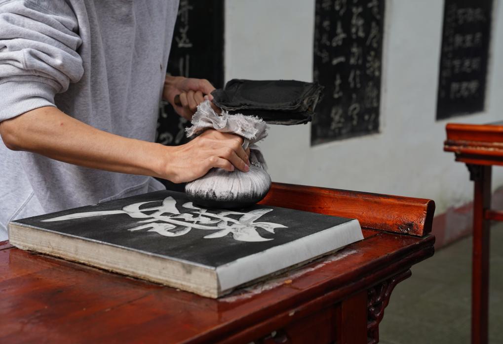 10月27日、重慶市奉節県の白帝城風景区で拓本を体験する観光客。(重慶=新華社記者/周佳誼)