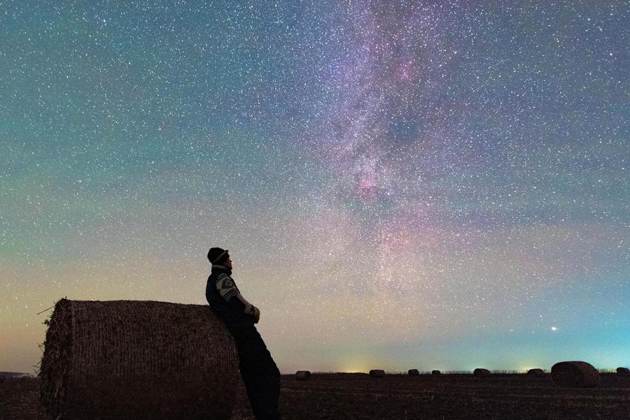 10月31日、黒竜江省同江市の公園で、銀河を観賞する人。(ハルビン=新華社配信/劉万平)