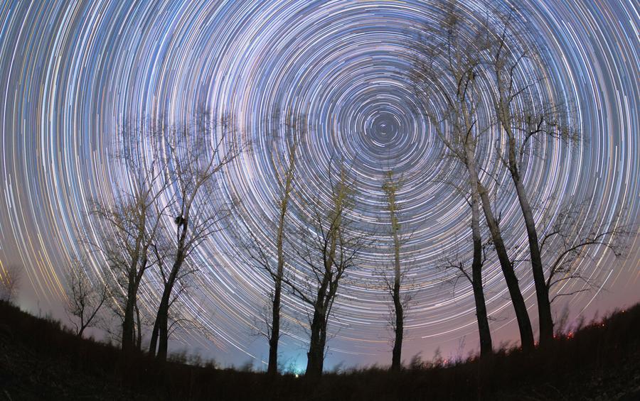 10月31日、黒竜江省富錦市の星空と木々。(比較明合成写真、ハルビン=新華社配信/庚喜慶)