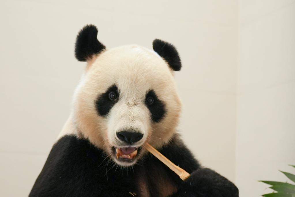 4日、中国ジャイアントパンダ保護研究センター綿陽基地で竹を食べる「華豹(ホワバオ)」。(綿陽=新華社配信)