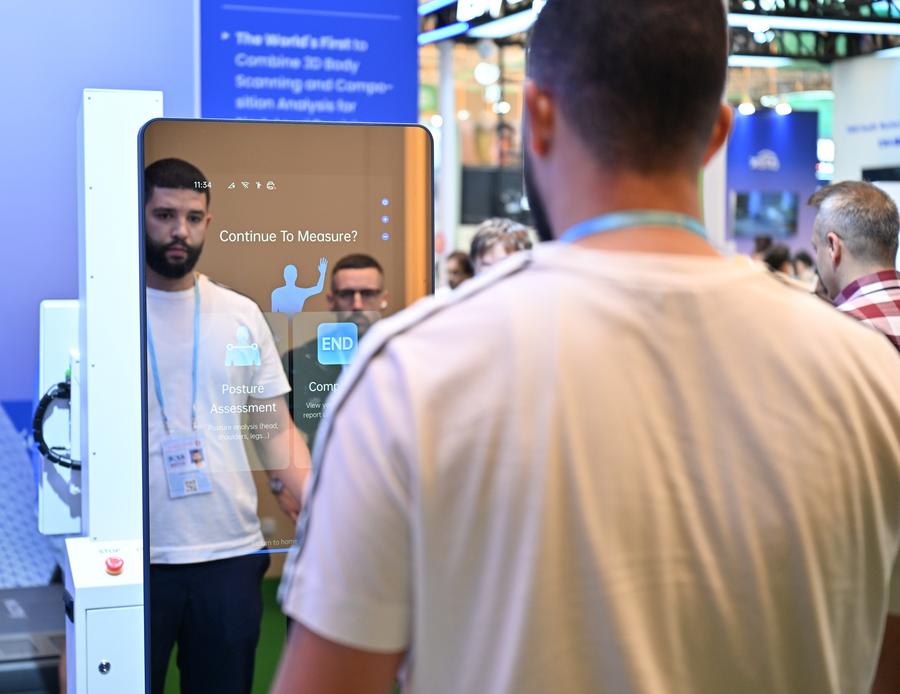 3日、第138回広州交易会で、スマート製品による身長測定を体験するバイヤー。(広州=新華社記者/肖恩楠)