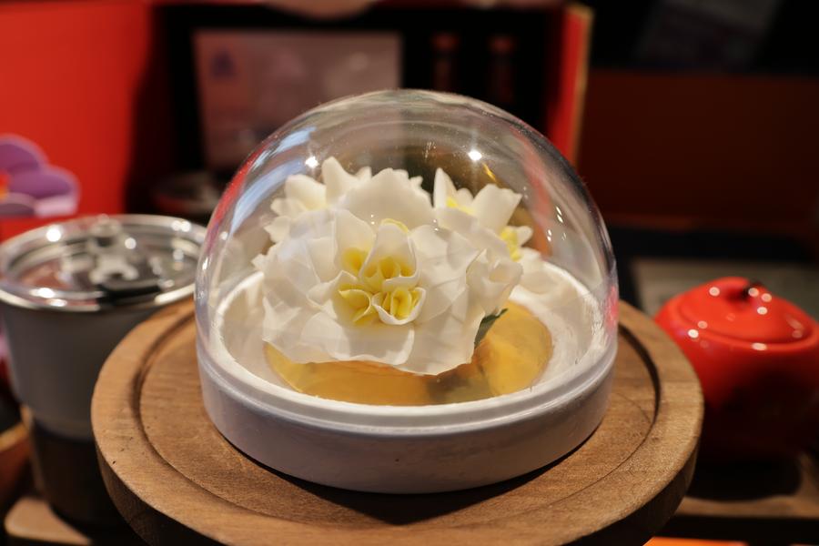 5日、泥塑(でいそ=泥人形)の技術で作られたスイセン。崇明区の彫刻技法は上海市の無形文化遺産に登録されている。(上海=新華社記者/藍建中)