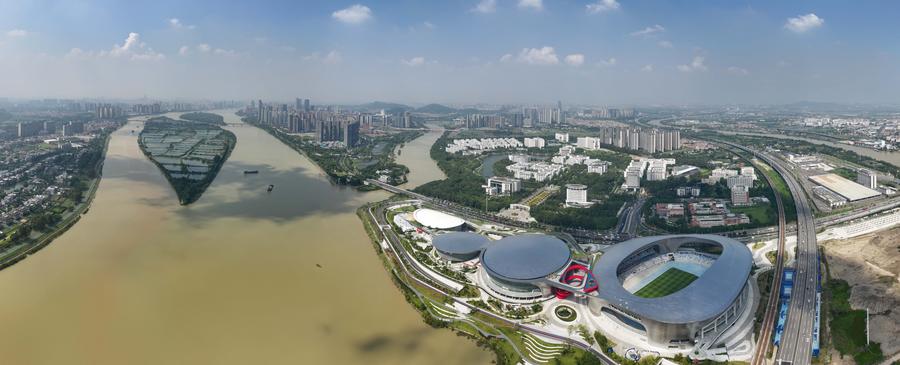 第15回全国運動会でサッカー・シニア女子、バスケットボール・シニア女子の会場となる広東省仏山市順徳区の徳勝スポーツセンターの一角。(10月18日、ドローンから、仏山=新華社記者/鄧華)