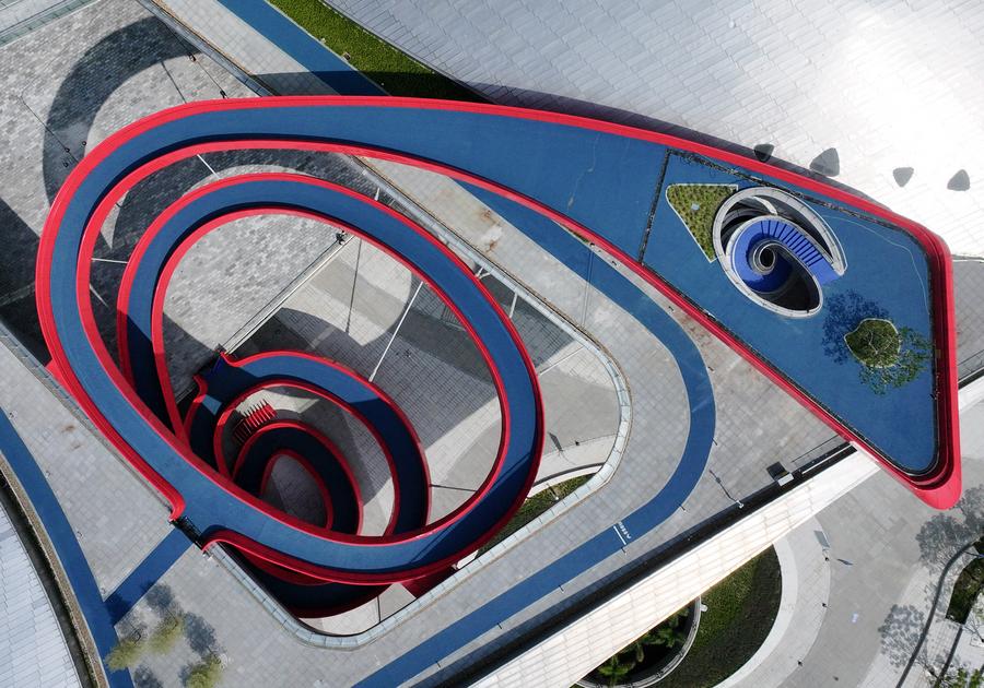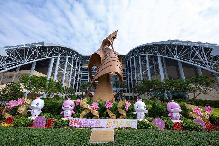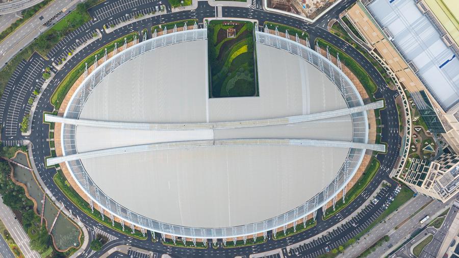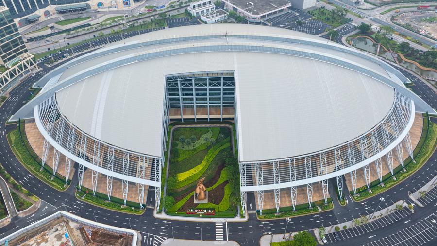 第15回全国運動会でバスケットボール女子U22(22歳以下)、マラソンの会場となる広東省深圳市の深圳湾スポーツセンター。(10月19日、ドローンから、深圳=新華社記者/梁旭)