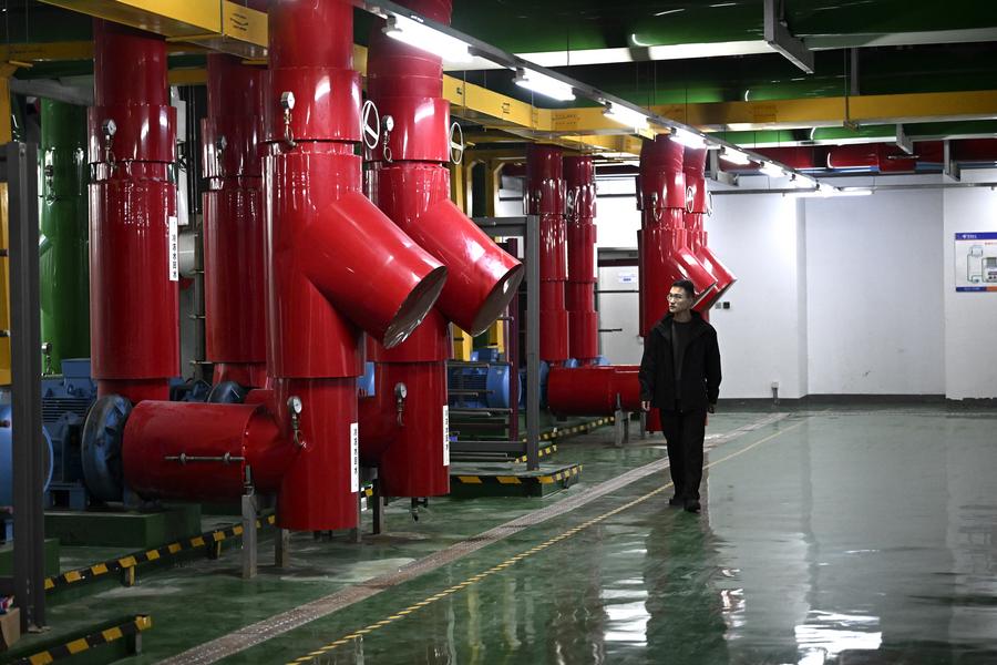 2日、宿州市計算力産業パークの冷却機室で、設備の稼働状況を確認する職員。(宿州=新華社記者/黄博涵)