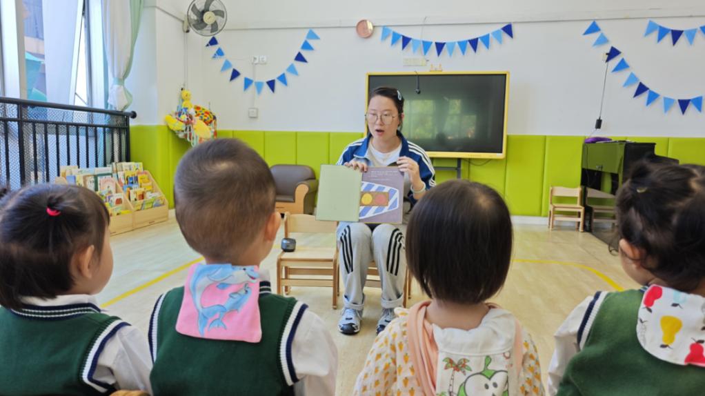 竜岩市博立保育園の年少クラスの教室で、子どもたちに絵本の読み聞かせをする保育士。(10月30日撮影、竜岩=新華社配信/劉黙涵)