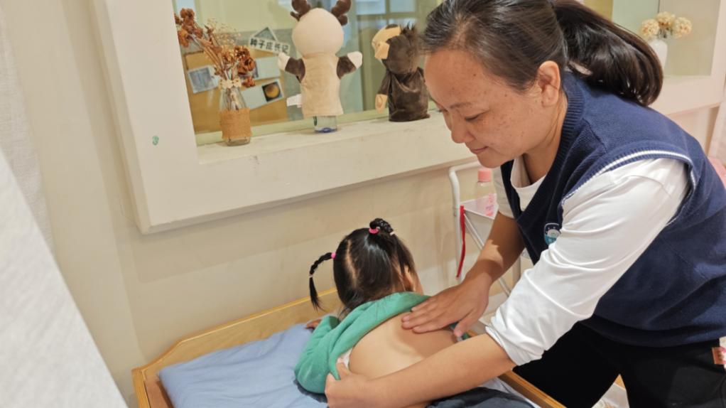 竜岩市顧坦森保育園で、子どもの健康を保つためのマッサージを行う保育士。(10月30日撮影、竜岩=新華社配信/劉黙涵)