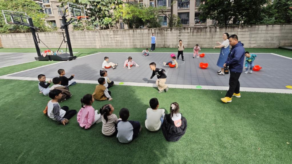 子どもたちと屋外でゲーム遊びをする竜岩市一心蓮荘保育園の保育士。(10月31日撮影、竜岩=新華社配信/劉黙涵)