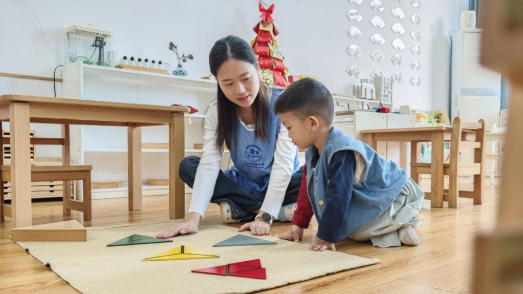 図形パズルを使った遊びを子どもに教える竜岩市一心蓮荘保育園の保育士。(10月31日撮影、竜岩=新華社配信/劉黙涵)