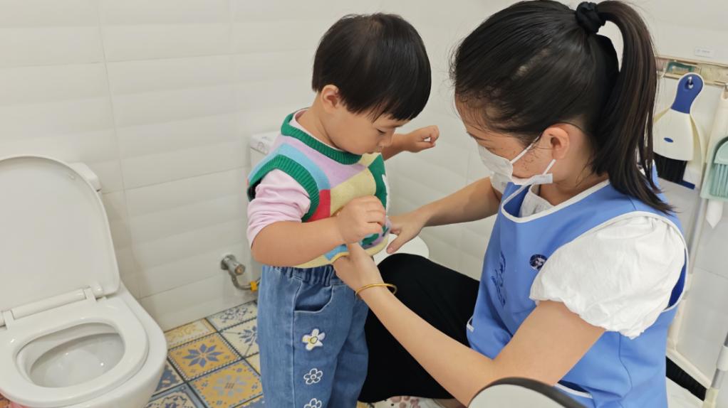 トイレトレーニング中の子どもの服を整える保育士。(10月31日撮影、竜岩=新華社配信/劉黙涵)