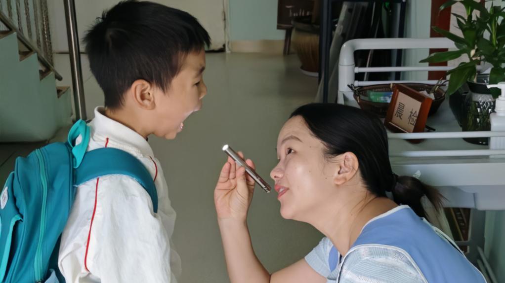 子どもの朝の健康チェックをする竜岩市一心蓮荘保育園の保育士。(10月31日撮影、竜岩=新華社配信/劉黙涵)