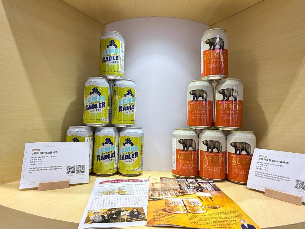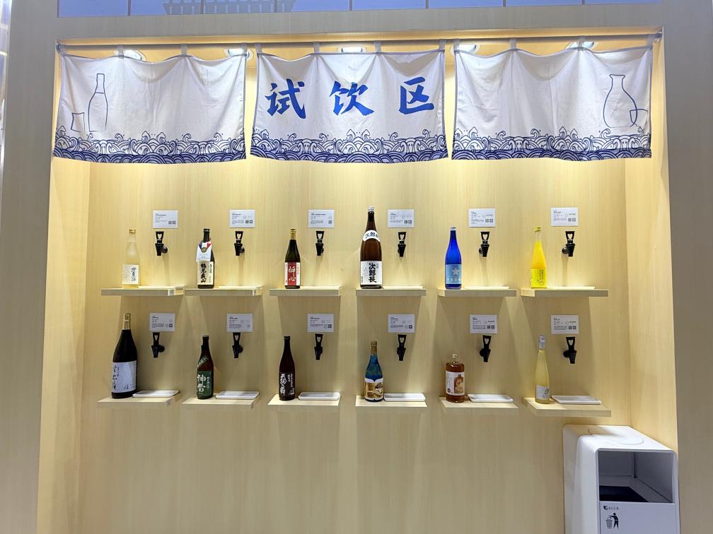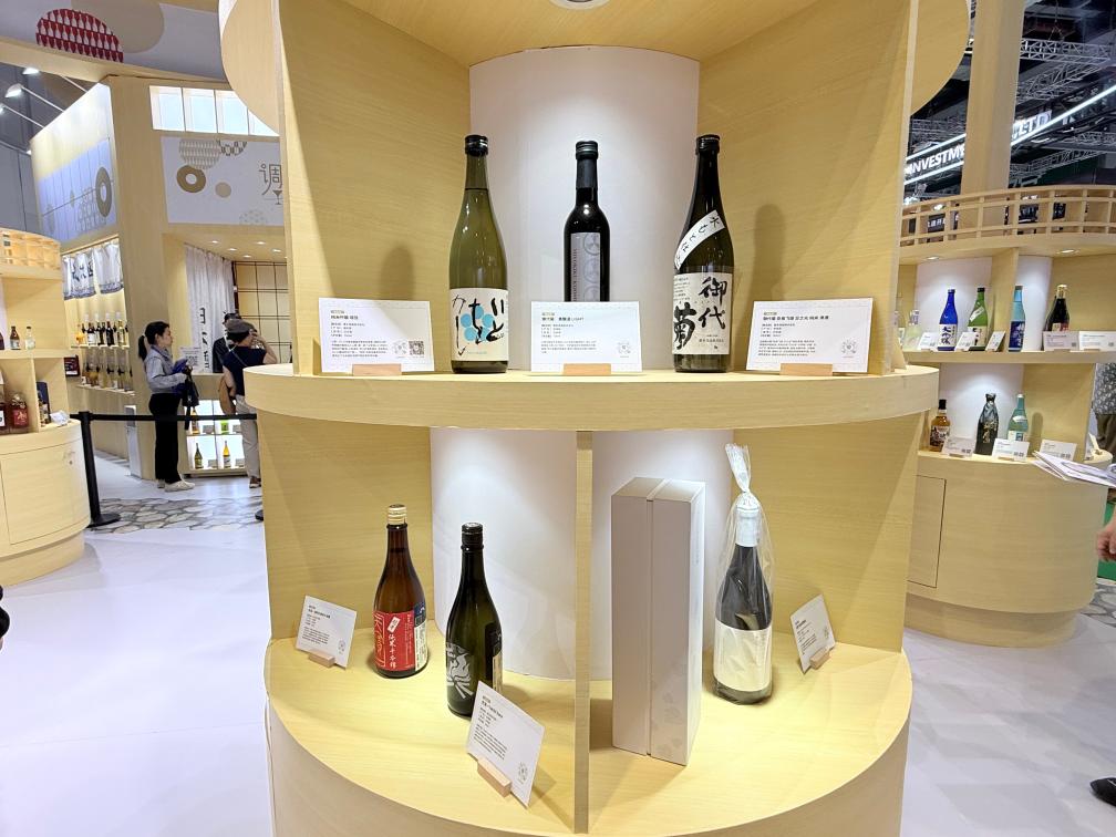 5日、ジェトロブースに並ぶ日本の酒類製品。(上海=新華社記者/方芸暁)