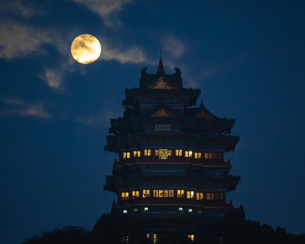 5日、天津市薊州区の空に輝く満月。(天津=新華社配信/李鵬岳)