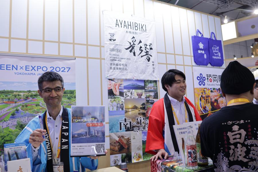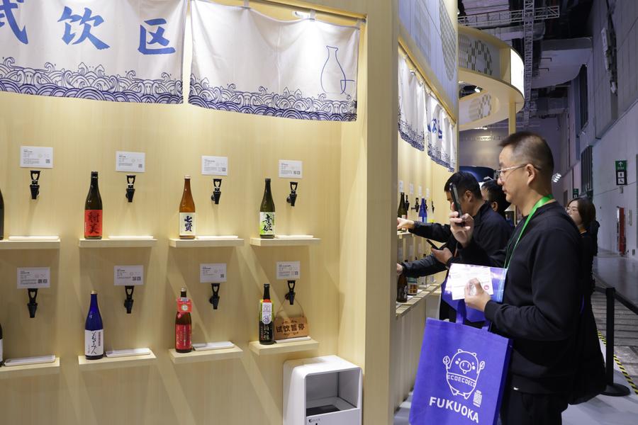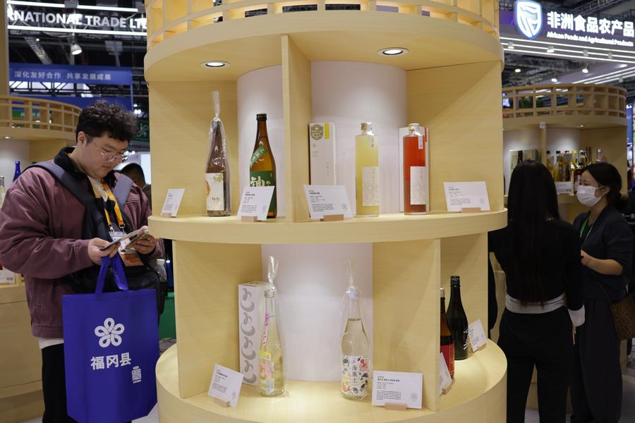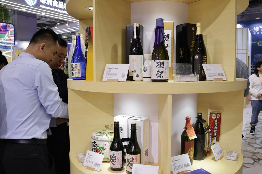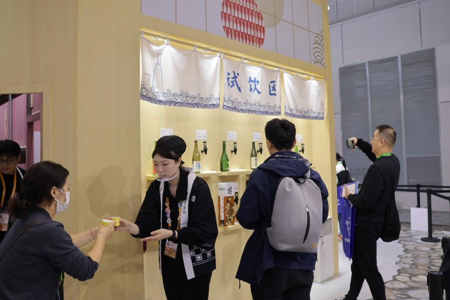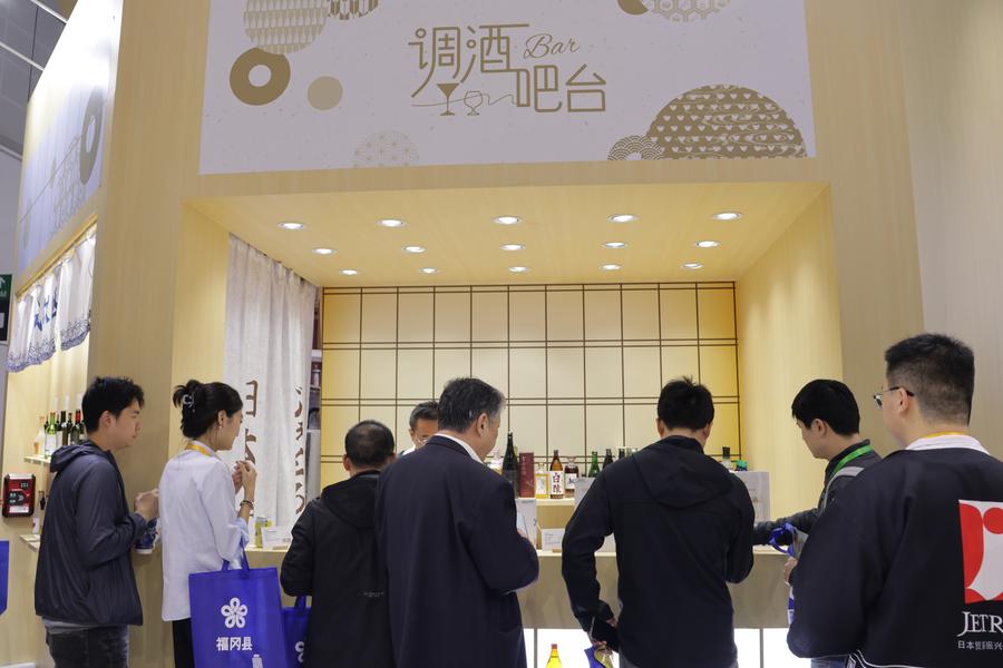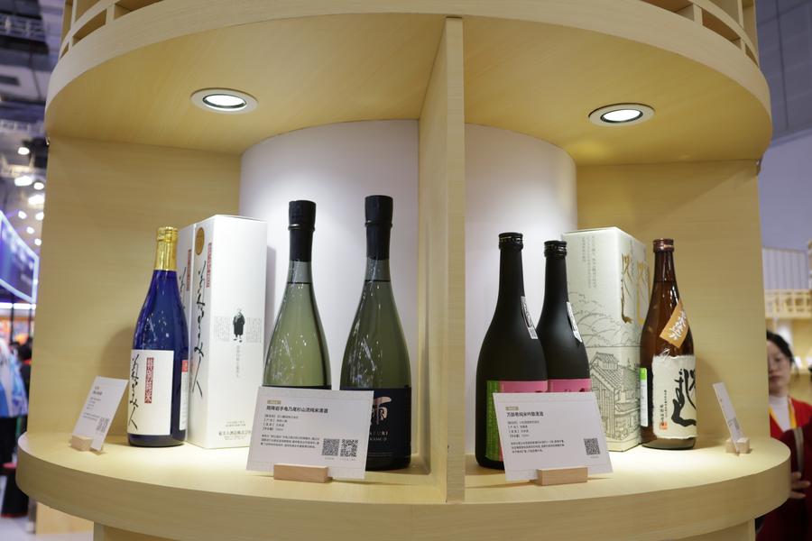 6日、ジェトロブースに並ぶ日本の酒類。(上海=新華社記者/藍建中)