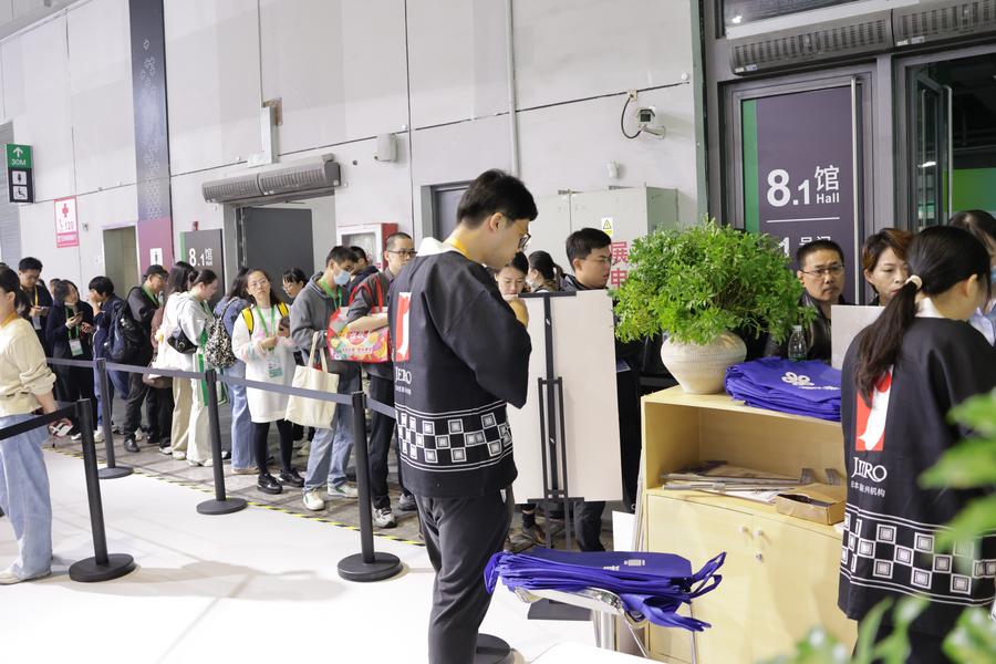 6日、ジェトロブースに集まる来場者。(上海=新華社記者/藍建中)