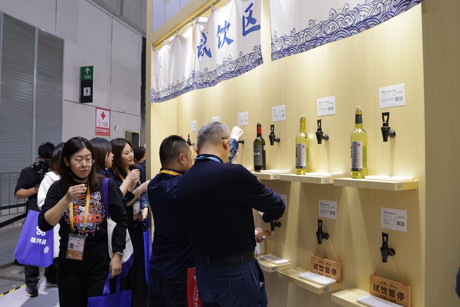 6日、ジェトロブースで日本の酒類を試飲する来場者。(上海=新華社記者/藍建中)