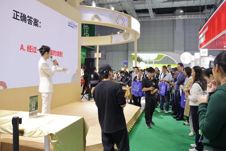 6日、ジェトロブースで行われた日本の酒類に関するクイズに参加する来場者。(上海=新華社記者/藍建中)