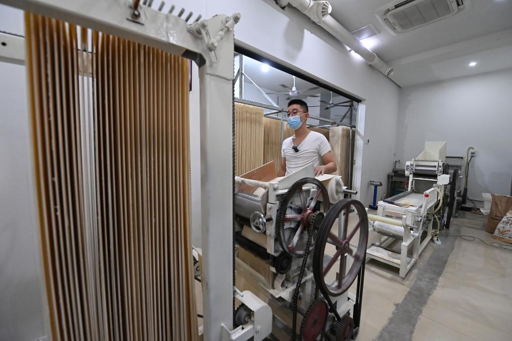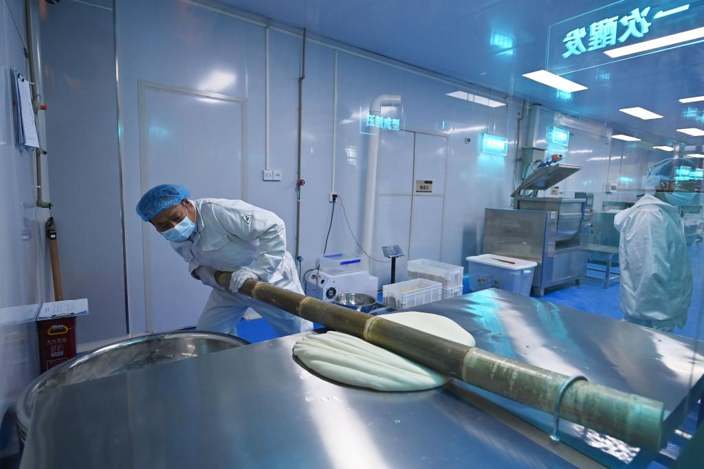 5日、重慶市雲陽県の喜禾麦麺業の認証基準をクリアした作業場で麺を製造する創業者の宋喜(そう・き)さん。1989年生まれの宋さんは銀行を退職し、2024年に同社を立ち上げた。(重慶=新華社記者/肖瀟)