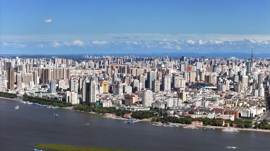 黒竜江省ハルビン市の松花江都市景観帯。(7月31日、ドローンから、ハルビン=新華社記者/王松)
