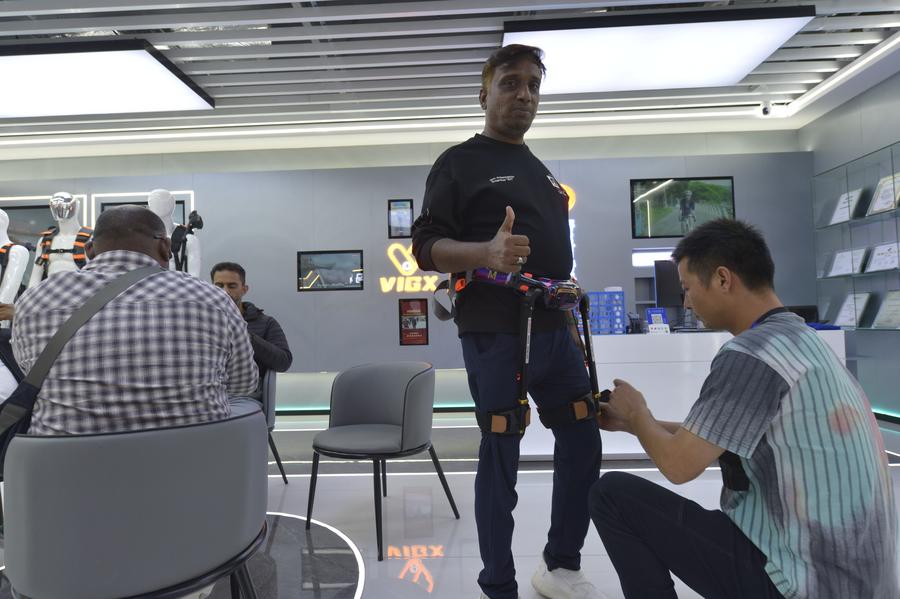 10月30日、浙江省義烏市のグローバルデジタルトレードセンター内にある店舗で、アシストスーツを試着する外国人バイヤー。(義烏=新華社記者/劉力航)