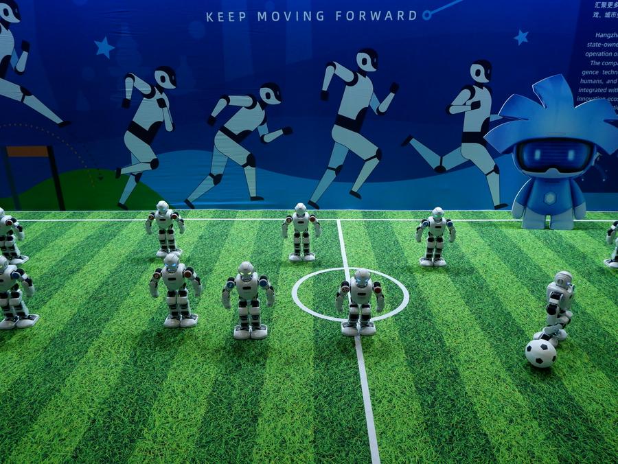6日、杭州城市大脳のブースに展示されたサッカーをするロボット。(烏鎮=新華社記者/陳雨寧)