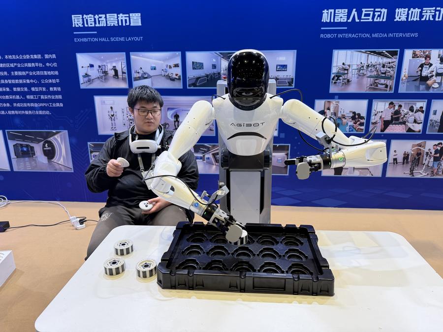 6日、スタッフの操縦で物をつかむ杭州湾具身智能革新センターのロボット。(烏鎮=新華社記者/陳雨寧)