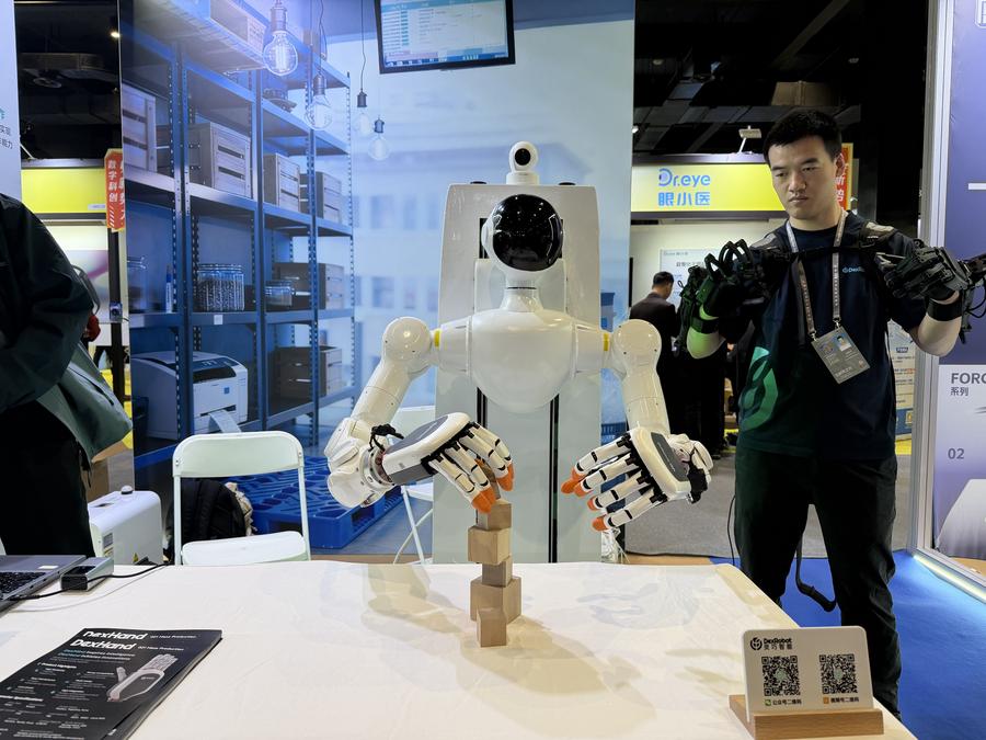 6日、スタッフの操縦でブロックを取る浙江霊巧智能科技のロボット。(烏鎮=新華社記者/陳雨寧)