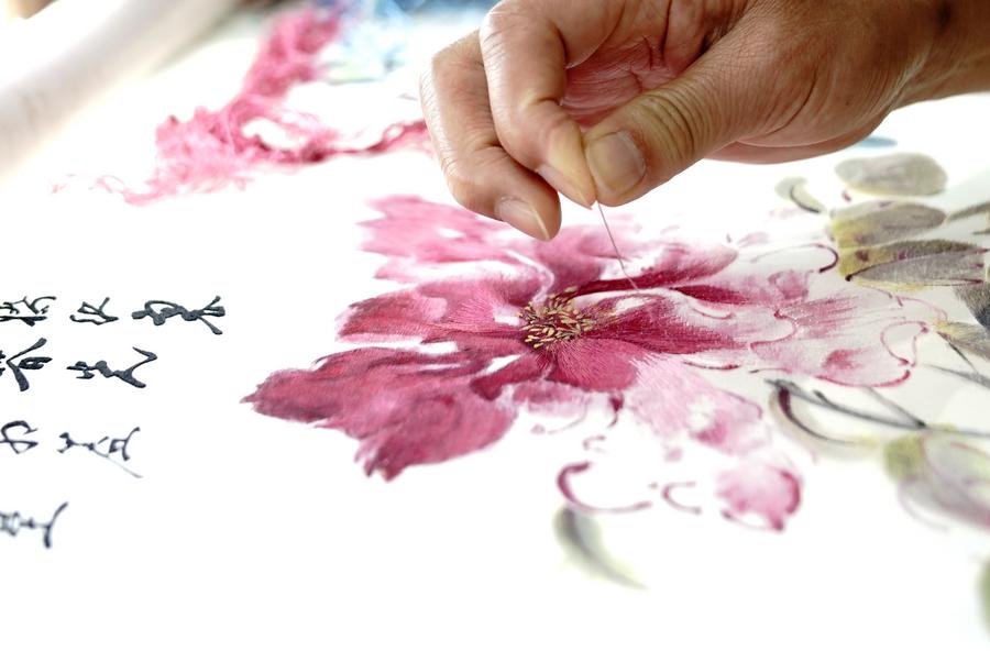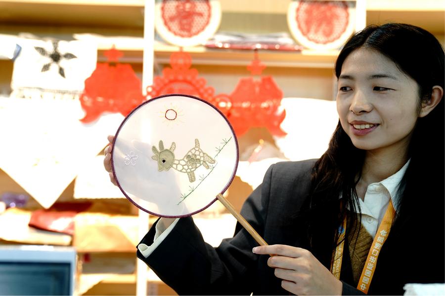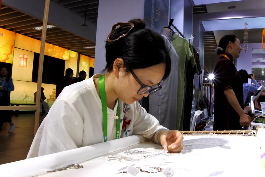 7日、輸入博の河南省エリアで実演されている開封の刺繍(ししゅう)技法「汴繍」。(上海=新華社記者/張建松)