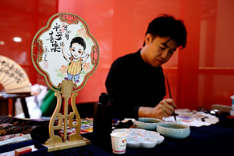 7日、輸入博の陝西省無形文化遺産ブースで制作実演をする芸術家。(上海=新華社記者/張建松)