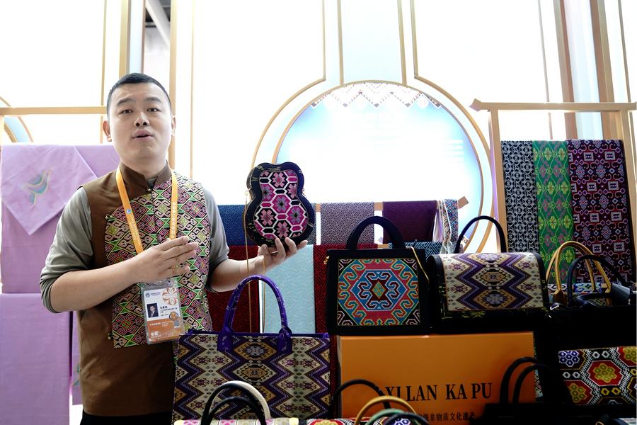 7日、輸入博の湖北省エリアで国家級無形文化遺産に登録されているトゥチャ族の絹織物「西蘭卡普(シランカプ)」を紹介する出展者。(上海=新華社記者/張建松)
