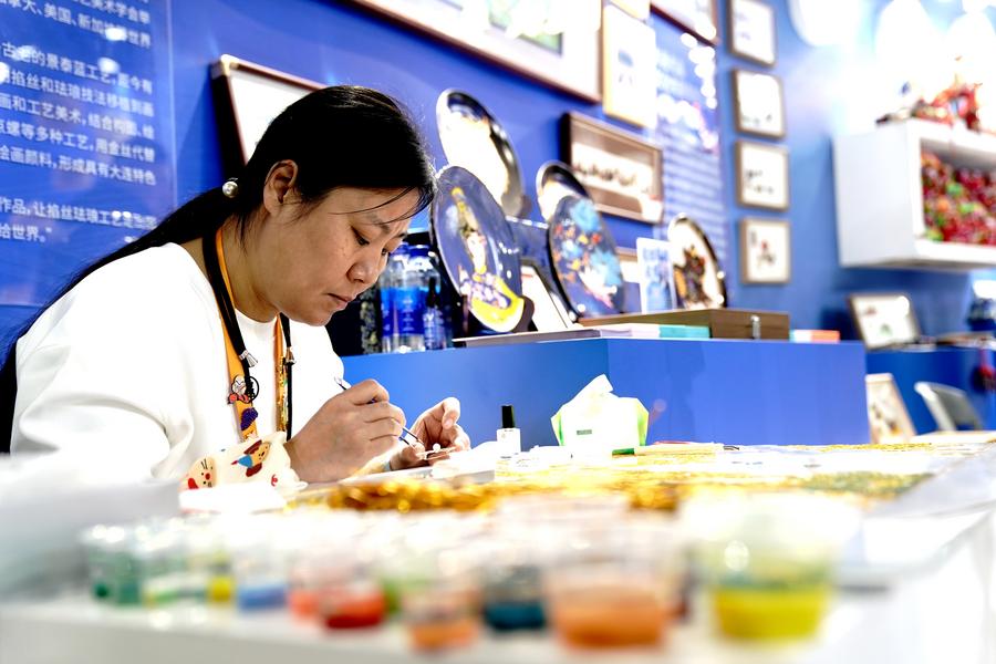 7日、輸入博の遼寧省エリアで無形文化遺産に登録されている掐絲琺瑯(こうしほうろう)の技法を実演する職人。(上海=新華社記者/張建松)