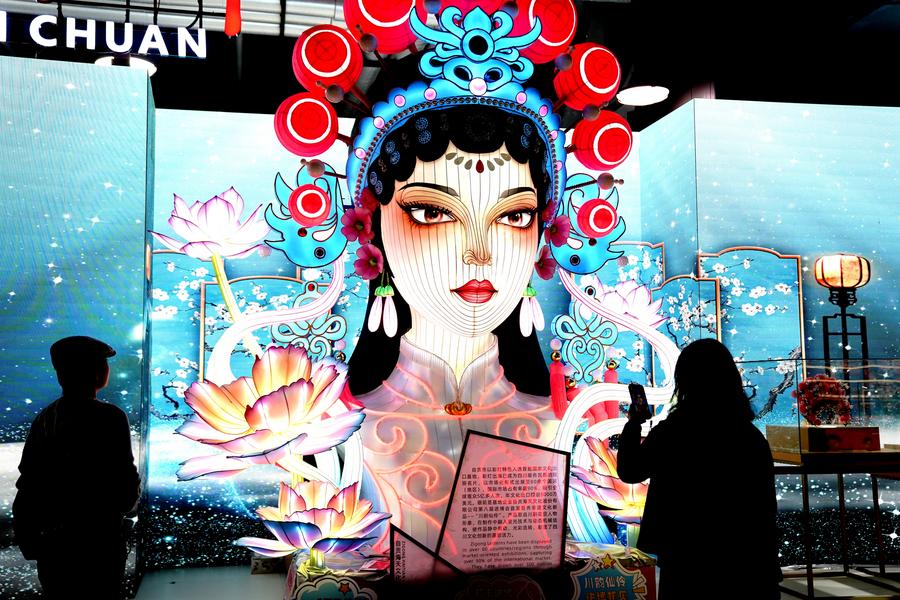7日、輸入博の四川省エリアで初公開された無形文化遺産の地方劇「川劇」とランタン「自貢彩灯」を組み合わせた新作「川劇仙伶」を見る人たち。(上海=新華社記者/張建松)